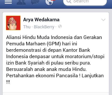 “Aliansi Hindu Muda Indonesia dan Gerakan Pemuda Marhaen (GPM) hari ini berdemonstrasi di depan Kantor Bank Indonesia denpasar untuk moratorium/stop izin Bank Syariah di pulau seribu pura. Bersuaralah anak anak muda Hindu. Pertahankan ekonomi Pancasila ! Lanjutkan !!!” demikian tulis Arya yang juga anggota Aliansi Hindu Muda (AHM)
